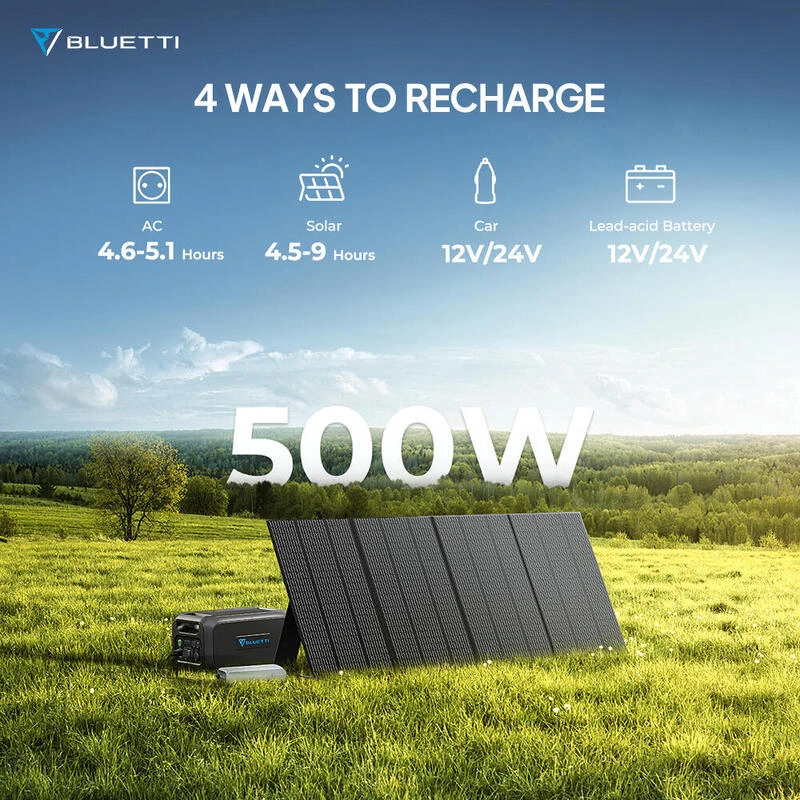 Le BLUETTI B230 a une capacitĂ© de 2 048 Wh et prend en charge la charge des batteries solaires, CA, de voiture et au plomb, ce qui en fait une source d’alimentation polyvalente.