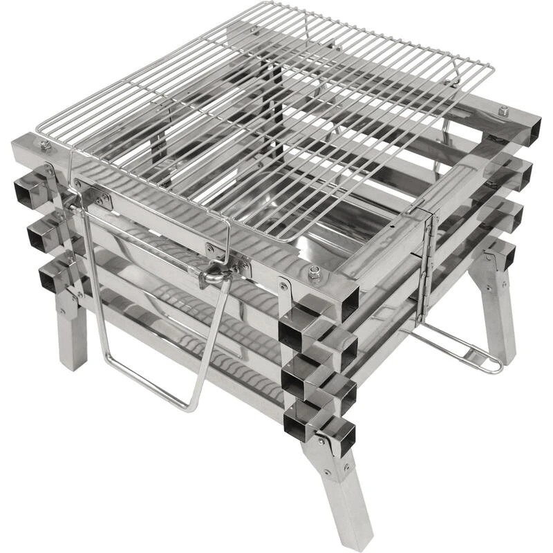 Gril pliable robuste en acier inoxydable avec hauteur de charbon réglable. Utilisable à la fois comme gril et foyer. Facile à assembler, sac de transport pratique. Plaisir de griller maximum !