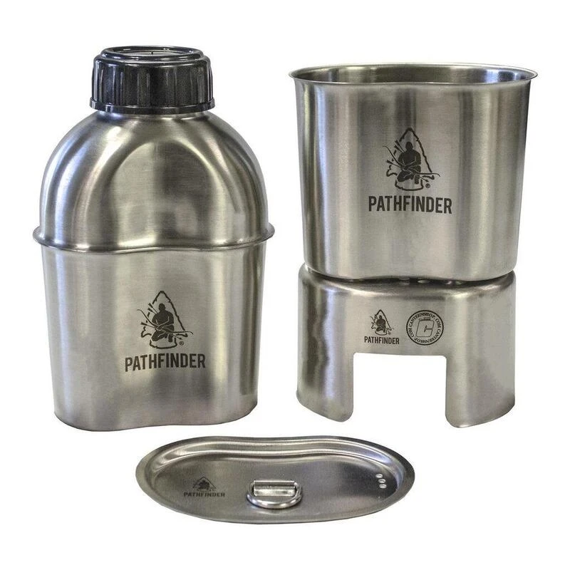 Le kit de cuisine camping Pathfinder RVS est parfait pour la cuisson en extérieur. Il comprend une flasque large à 1,15L, une casserole de 0,7L avec un couvercle et un réchaud. Toutes les pièces