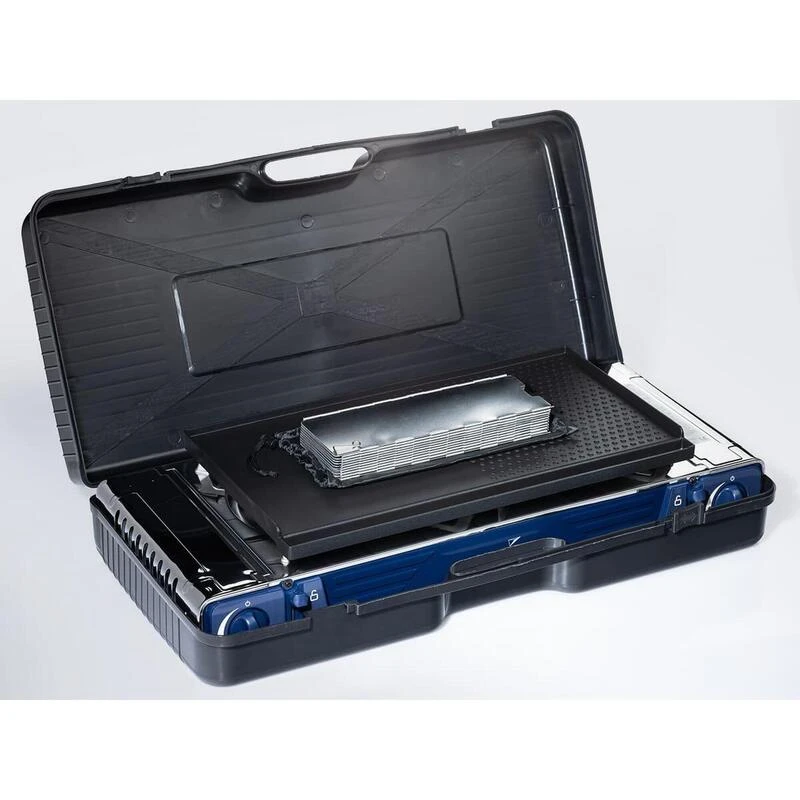 Set comprenant Plaque plancha, coupe-vent et réchaud de camping robuste pour cartouches de gaz MSF-1A 227 g – acier inoxydable – puissance réglable – sûr et facile à utiliser